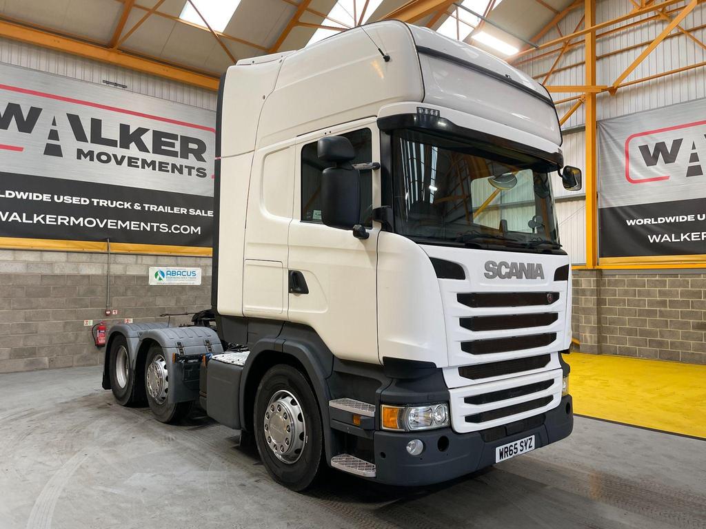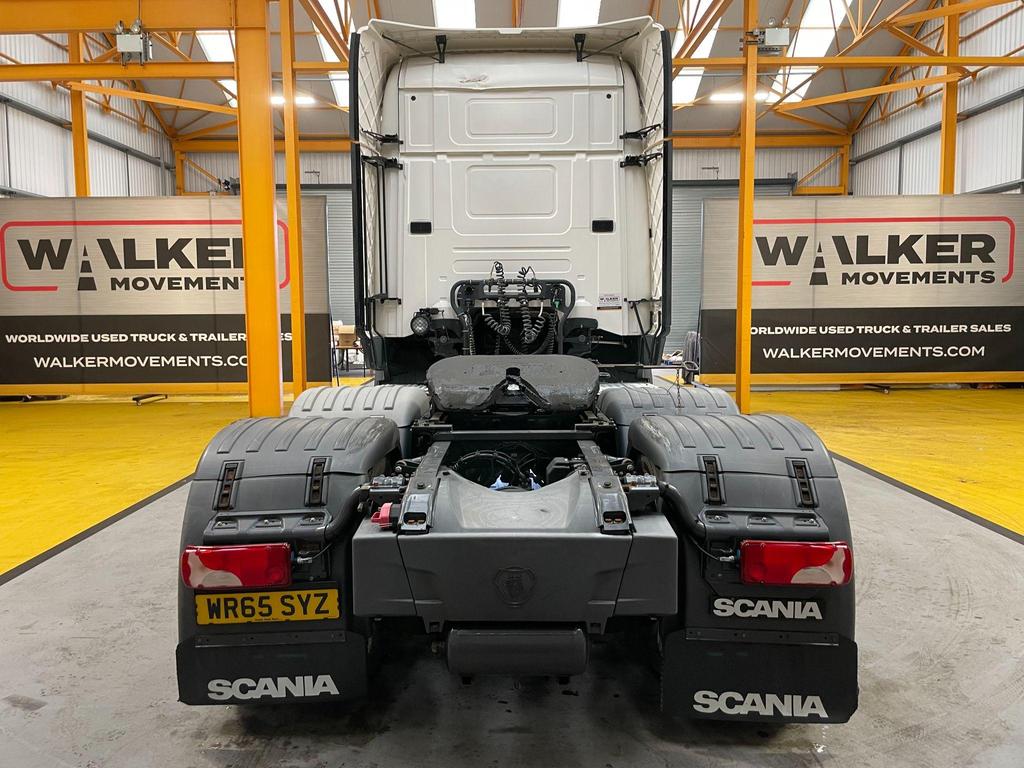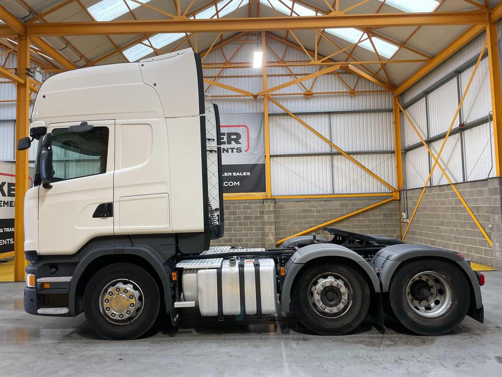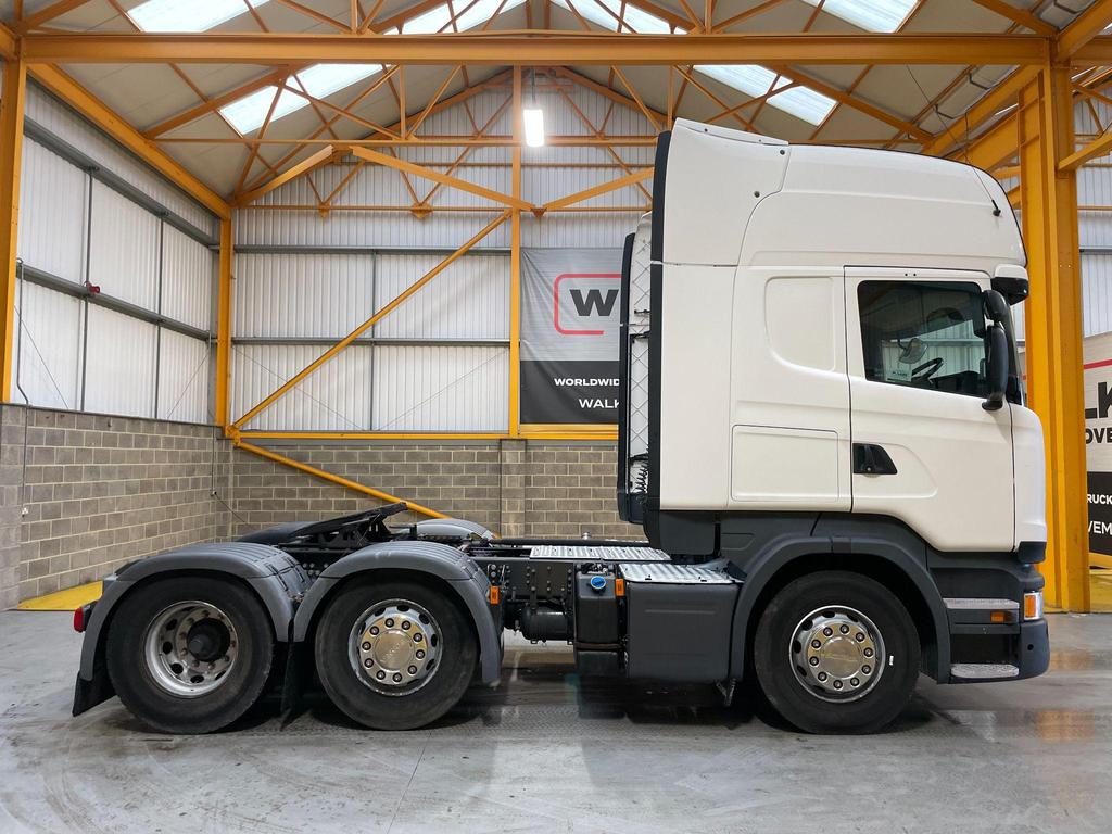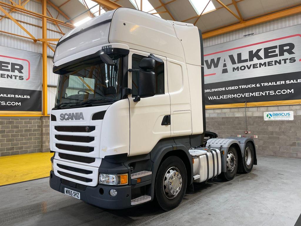 Scania R Series Topline High Roof Sleeper Cab c/w 4 Point Air Suspension. Scania 450 Bhp Turbo Air to Air Charge Cooled Euro 6 Engine C/w Ad Blue. Scania 2 Pedal Opticruise Semi Automatic Gearbox (Without Clutch Pedal). Single Reduction Drive Axle c/w Diff Lock. ECAS Drive Axle Air Suspension c/w In Cab Hand Held Raise/Lower Control. Air Suspended Midlift/Steer Axle. Full Disc Braking System c/w ABS /EBS Control. Jost Sliding Fifth Wheel. Aluminium Chassis Catwalk. Aluminium Fuel Tank. Full Air Deflector Kit c/w Cab Side Extensions. Exterior Sunvisor c/w Inset Mounted Spot Lamps. Air Suspended Drivers Seat c/w Adjustable Lumbar Support. Programmable Night Heater. Electric Driver and Passenger Windows. Electric Adjustable Heated Mirrors. Digital Climate Controlled Air Conditioning (Not Tested). Roof Mounted Auxiliary Cab Cooler. RDS Radio/CD Player. Switchable Traction Control. Hill Start Assist. Cruise Control. Underbunk Fridge. Plated Weight : 44,000 Kgs. Design Weight : 45,000 Kgs. Mileage As Shown : 712,422 Kms. Tested Until End : October 2025 Registration Number : WR65SYZ Spec Number : 34254