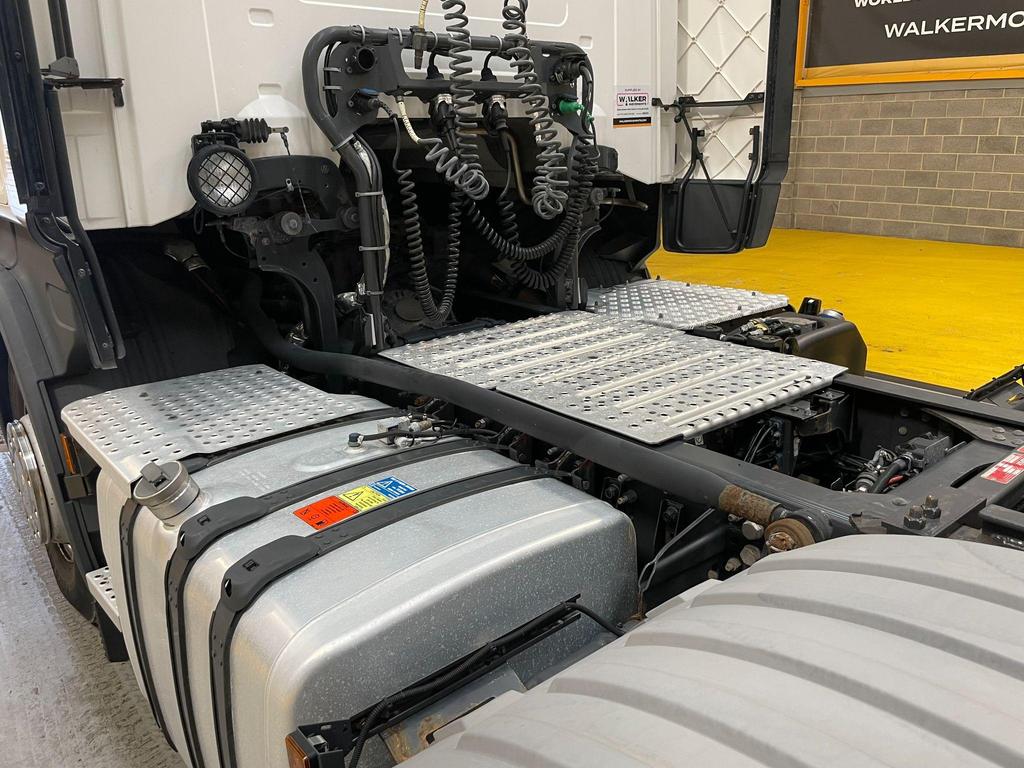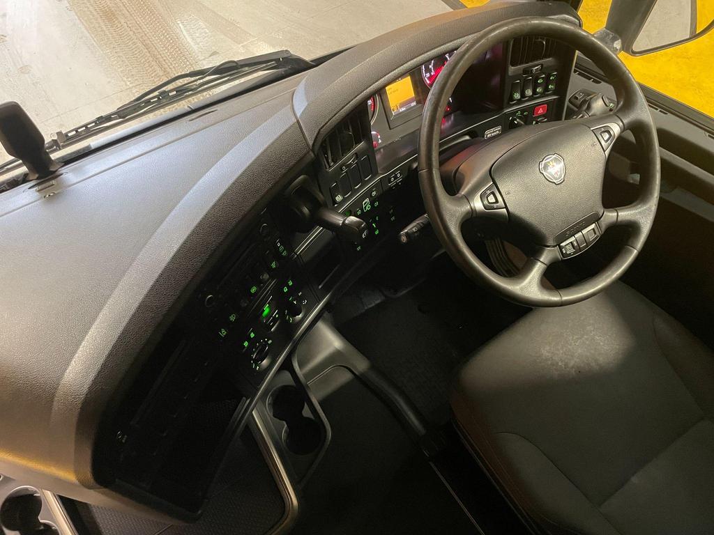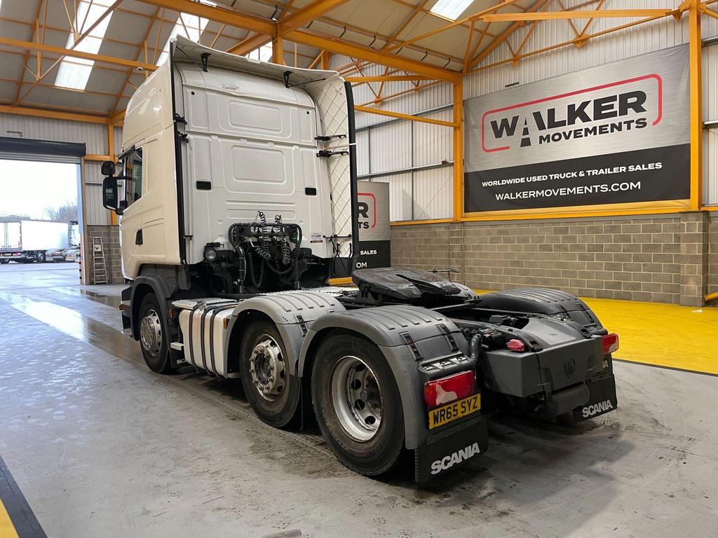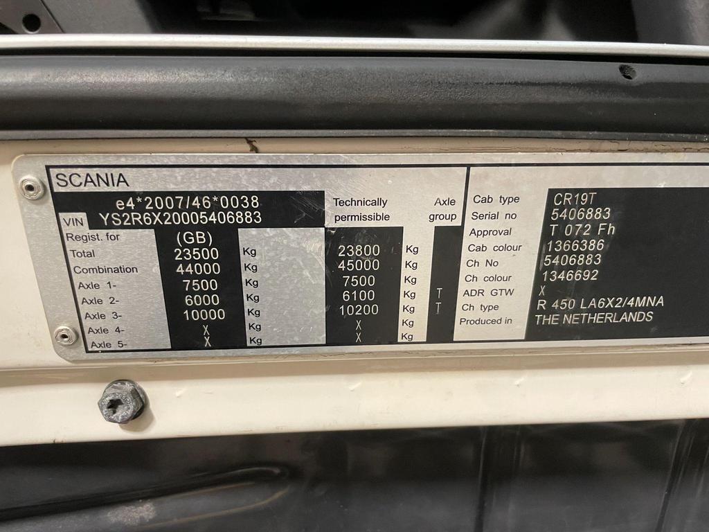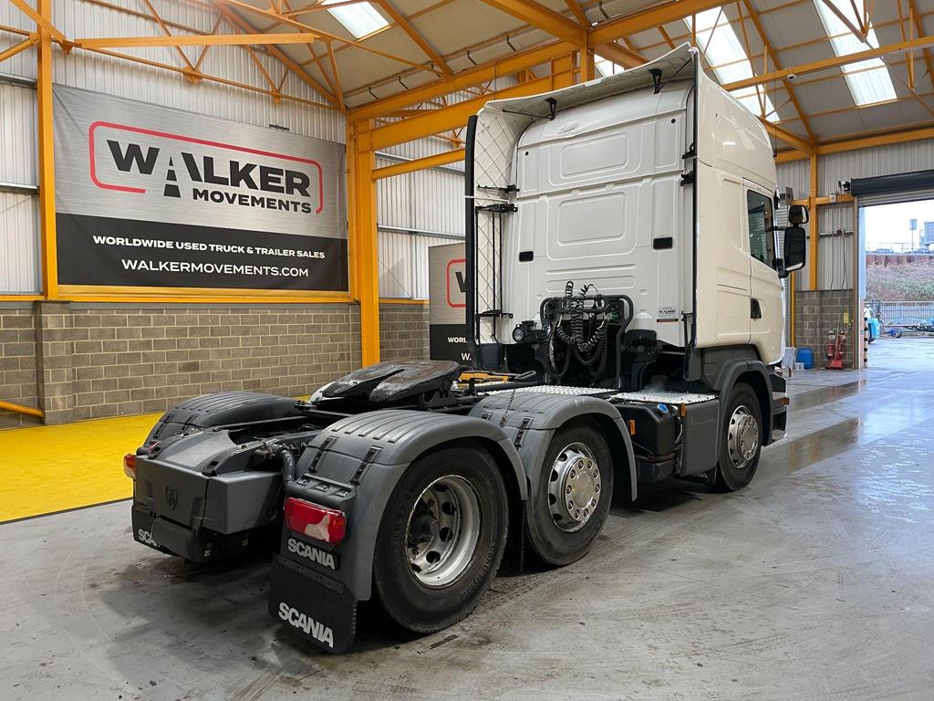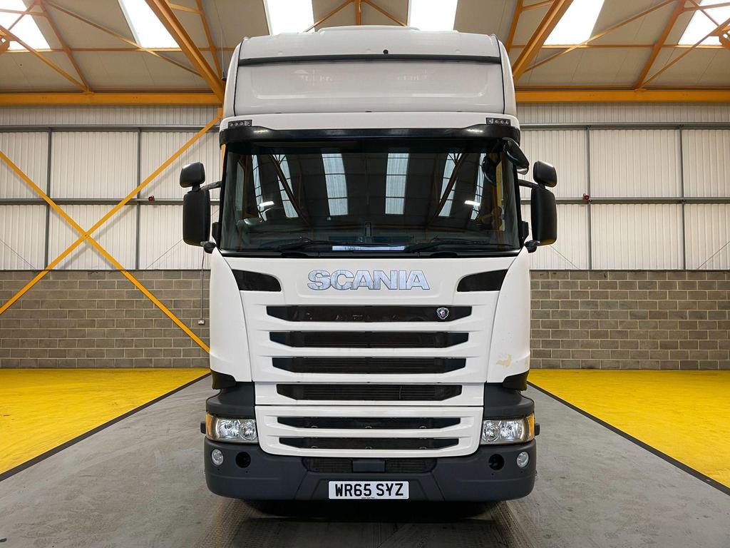 Scania R Series Topline High Roof Sleeper Cab c/w 4 Point Air Suspension. Scania 450 Bhp Turbo Air to Air Charge Cooled Euro 6 Engine C/w Ad Blue. Scania 2 Pedal Opticruise Semi Automatic Gearbox (Without Clutch Pedal). Single Reduction Drive Axle c/w Diff Lock. ECAS Drive Axle Air Suspension c/w In Cab Hand Held Raise/Lower Control. Air Suspended Midlift/Steer Axle. Full Disc Braking System c/w ABS /EBS Control. Jost Sliding Fifth Wheel. Aluminium Chassis Catwalk. Aluminium Fuel Tank. Full Air Deflector Kit c/w Cab Side Extensions. Exterior Sunvisor c/w Inset Mounted Spot Lamps. Air Suspended Drivers Seat c/w Adjustable Lumbar Support. Programmable Night Heater. Electric Driver and Passenger Windows. Electric Adjustable Heated Mirrors. Digital Climate Controlled Air Conditioning (Not Tested). Roof Mounted Auxiliary Cab Cooler. RDS Radio/CD Player. Switchable Traction Control. Hill Start Assist. Cruise Control. Underbunk Fridge. Plated Weight : 44,000 Kgs. Design Weight : 45,000 Kgs. Mileage As Shown : 712,422 Kms. Tested Until End : October 2025 Registration Number : WR65SYZ Spec Number : 34254